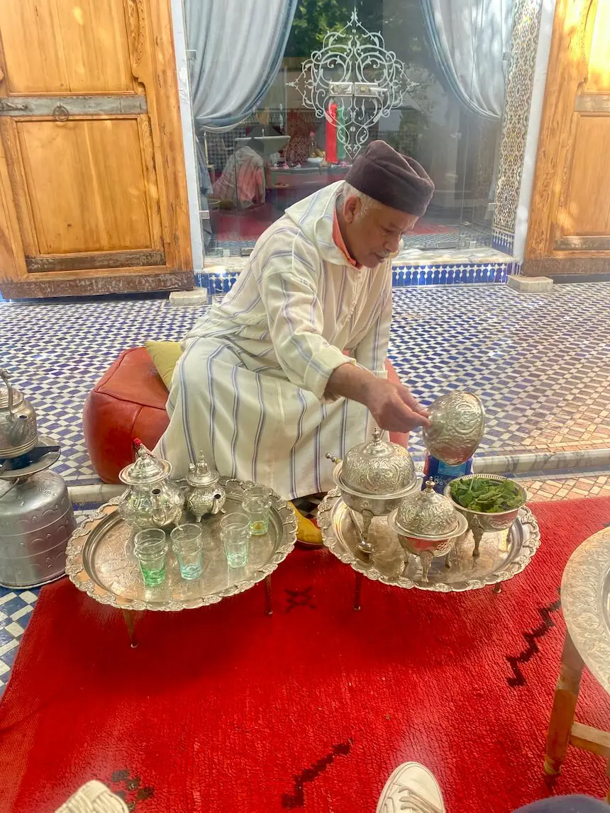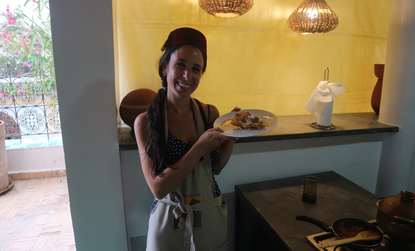 One of the reasons that Palais Amani is one of the best riads to stay in Fes is because it has also has an amazing daily cooking class on its property – Fez Cooking School! We took part in the cooking class on our last night and I think it was our favorite meal in all of our Morocco trip! It was a super small group which meant it was quite personal and engaging for all. We made an eggplant tomato appetizer, a chicken dish for the main and an insanely amazing dessert which I can only resemble its taste to (better than) funnel cake in America. For the vegetarians, the main is able to be swapped out for a full, heavy veggie meal (my friend did this) and still raved about the food, so the class really can cater to anyone. As I mentioned already, the food in general in Morocco exceeded my expectations (no one talks about Moroccan food enough globally) and our whipped up meal during Fez Cooking School at Palais Amani was one of my favorites. Whether you stay at Palais Amani or not, you MUST do the Fez Cooking School class when traveling to Fes. I love to do cooking classes or food tours in all of the cities I visit so that I can really understand what the locals eat and the flavors that make each country unique and Fez Cooking School was the way to do that.