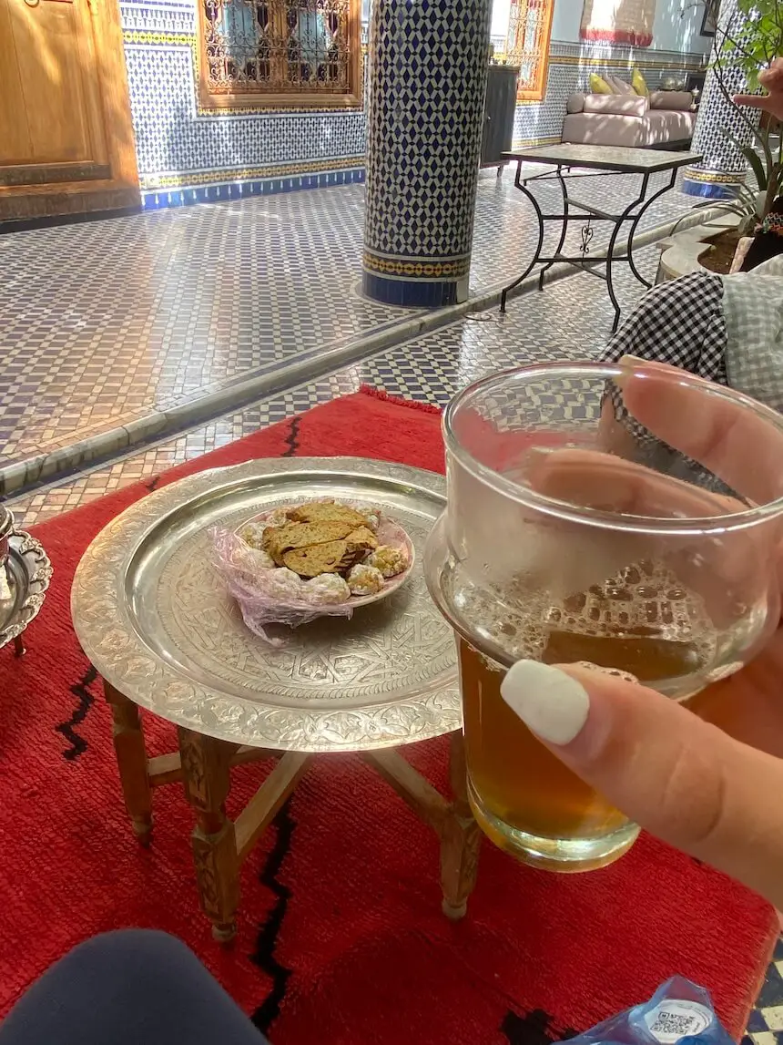 When you first arrive in Fez, your driver will already have communicated with the Riad and they will meet you at the closest point cars can go outside the Medina. The Riad porter will carry all of these huge bags (at least ours were huge) through winding, tiny allies for you without accepting any help. Once you enter Palais Amani you will feel like you have no idea what just happened as you go straight from the crazy Medina streets into the amazing courtyard of an oasis that is Riad Palais Amani. They will bring you to the middle of the courtyard and offer you fresh mint tea and cookies, which were amazing. Only after 10 minutes of relaxing your room will be ready.
